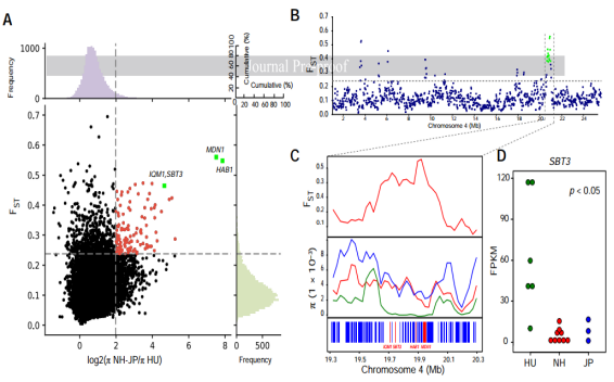 圖3 湖桑(NH-JP/π HU)馴化群體選擇研究