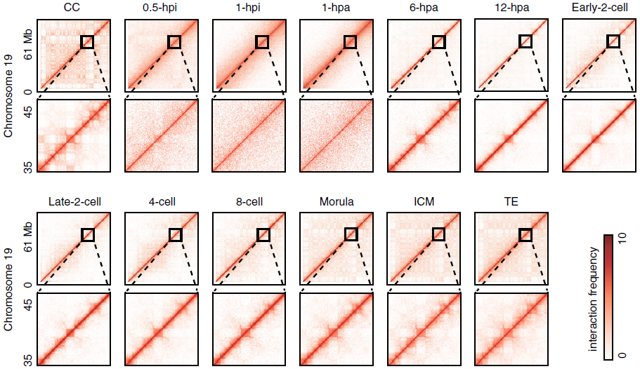 同濟(jì)大學(xué)生命科學(xué)與技術(shù)學(xué)院高紹榮團(tuán)隊(duì)與江賜忠團(tuán)隊(duì)在Nature Communications雜志發(fā)表了Hi-C互作的相關(guān)研究成果。他們采用經(jīng)過優(yōu)化的少量細(xì)胞全基因組染色質(zhì)構(gòu)象捕獲技術(shù)(sisHi-C),對(duì)小鼠SCNT胚胎發(fā)育過程進(jìn)行連續(xù)采樣,詳細(xì)描繪了SCNT植入前胚胎染色質(zhì)高級(jí)結(jié)構(gòu)的動(dòng)態(tài)變化過程。