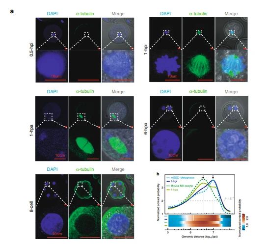 免疫熒光染色在1-hpi和1-hpa胚胎中檢測(cè)到紡絲裝置凝聚的染色體,這與其他階段胚胎中帶有核膜的間期染色質(zhì)形態(tài)不同(圖2a)。進(jìn)一步分析表明,1-hpi胚胎的P(s)曲線與小鼠ESC中期相似,在10Mb時(shí)迅速下降,而1-hpa胚胎的P(s)曲線與小鼠MII卵母細(xì)胞相似,在4Mb時(shí)突然下降(圖2b)。這表明當(dāng)供體細(xì)胞在去核卵母細(xì)胞中被人工激活1個(gè)小時(shí)(1-hpa)后,基因組經(jīng)歷了從類有絲分裂中期向類第二次減數(shù)分裂中期的轉(zhuǎn)變。