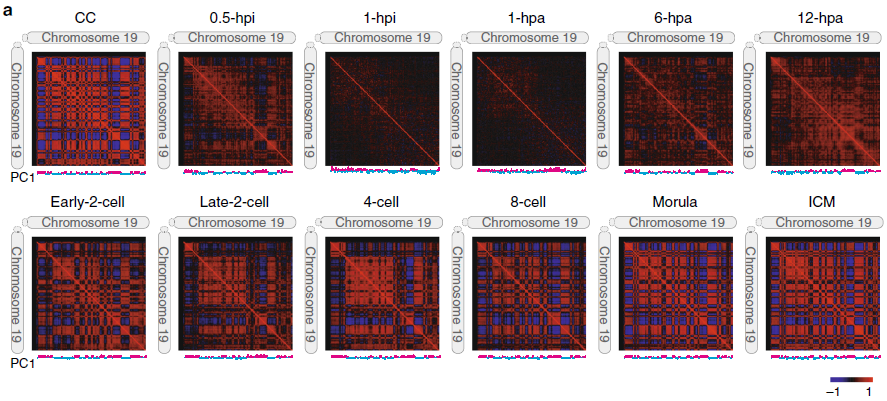 不同時(shí)期的胚胎的染色質(zhì)三維構(gòu)象見下圖,圖中分別展示了分辨率為100kb和40kb時(shí)的Hi-C互作矩陣。將CC(Cumulus cell)核注入無核卵母細(xì)胞后,染色質(zhì)結(jié)構(gòu)TADs和Compartments迅速溶解,并在6-hpa胚胎中部分恢復(fù)。令人驚訝的是,1-hpi和1-hpa單細(xì)胞胚胎遠(yuǎn)端相互作用明顯較少,并顯示出一致的相互作用模式,這與中期染色質(zhì)組織狀態(tài)高度相似。