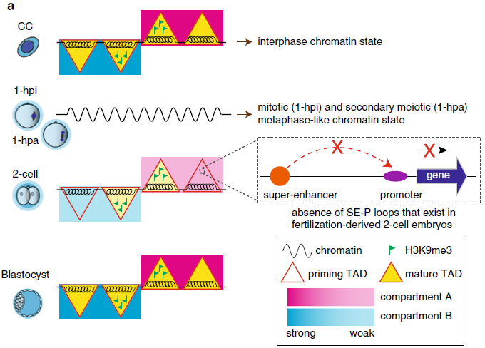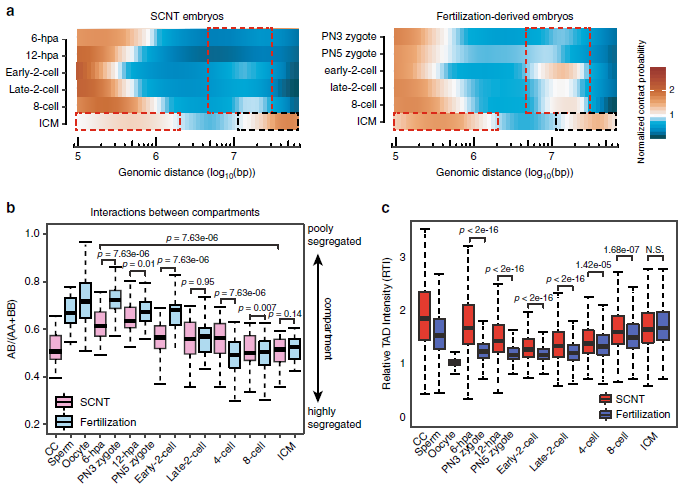 2020年4月14日,同濟(jì)大學(xué)生命科學(xué)與技術(shù)學(xué)院高紹榮團(tuán)隊(duì)與江賜忠團(tuán)隊(duì)在Nature Communications雜志在線發(fā)表了相關(guān)研究成果。他們采用經(jīng)過優(yōu)化的少量細(xì)胞全基因組染色質(zhì)構(gòu)象捕獲技術(shù)(in situ Hi-C),對(duì)小鼠SCNT胚胎發(fā)育過程進(jìn)行連續(xù)采樣,并詳細(xì)描繪了SCNT植入前胚胎染色質(zhì)高級(jí)結(jié)構(gòu)的動(dòng)態(tài)變化過程,同時(shí)說明體細(xì)胞在移植到無核卵母細(xì)胞后,成熟的三維染色質(zhì)結(jié)構(gòu)是如何被重新編程為全能狀態(tài)的。