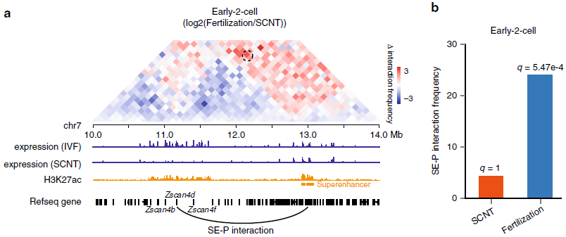 研究表明小鼠SCNT胚胎在合子基因組激活(ZGA)時(shí)期有大量的基因未能被正常激活。于是,作者探究了染色質(zhì)空間結(jié)構(gòu)的異常是否會(huì)導(dǎo)致增強(qiáng)子與啟動(dòng)子之間的相互作用無法成功建立。在早2細(xì)胞胚胎,發(fā)現(xiàn)關(guān)鍵基因Zscan4d的啟動(dòng)子與上游的超級(jí)增強(qiáng)子的SE-P相互作用在受精卵中很明顯,而在SCNT胚胎中則不存(圖5)。