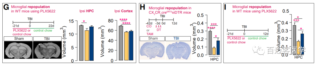 研究還發(fā)現(xiàn),經(jīng)歷過(guò)小膠質(zhì)細(xì)胞耗竭和再生的小鼠的大腦海馬組織體積更大(圖3G-I)。