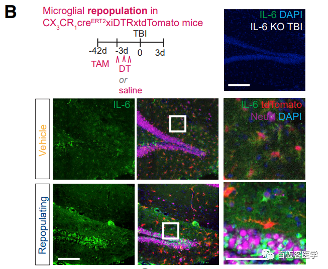 ?圖4 .TBI遺傳模型小鼠中IL-6的細(xì)胞來(lái)源及正在進(jìn)行再生的小膠質(zhì)細(xì)胞