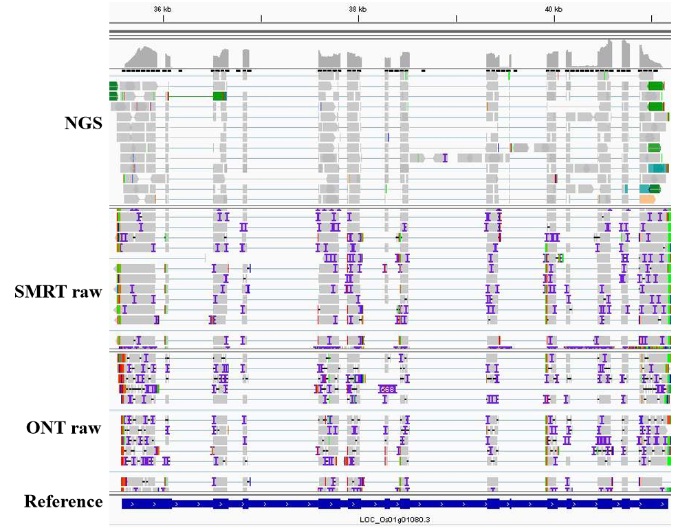 基于三代測序平臺(tái)可以直接獲取轉(zhuǎn)錄本的5ˊ到3ˊ高質(zhì)量全長序列,無需組裝,一條read即可跨越全長轉(zhuǎn)錄本,因此通過將read比對基因組就能夠非常容易的確定基因在基因組上的位置和其完整結(jié)構(gòu),因而非常有利于基因的注釋工作,且準(zhǔn)確性較高(參見下圖以水稻一個(gè)基因?yàn)槔?/p>