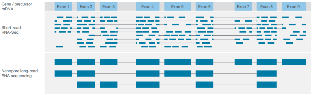 在可變剪接方面,三代全長測序結(jié)果可以捕獲更多、更準(zhǔn)的、不同可變剪切形成的轉(zhuǎn)錄本,如圖4顯示,Exon2和Exon6以及Exon9是三個(gè)轉(zhuǎn)錄本間共享,二代多數(shù)短read單條連一個(gè)外顯子區(qū)都無法跨越,對于完全比對到這3個(gè)外顯子區(qū)的短reads無法區(qū)分其來源轉(zhuǎn)錄本。而Nanopore長讀長測序可以直接得到3種全長轉(zhuǎn)錄本,因此對于轉(zhuǎn)錄本可變剪接識(shí)別更準(zhǔn)確。