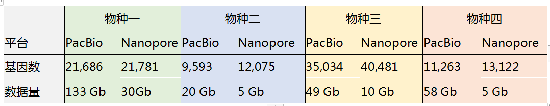 表1 不同物種PacBio與Nanopore獲取相近高準(zhǔn)確基因數(shù)量時(shí)對應(yīng)所需數(shù)據(jù)量