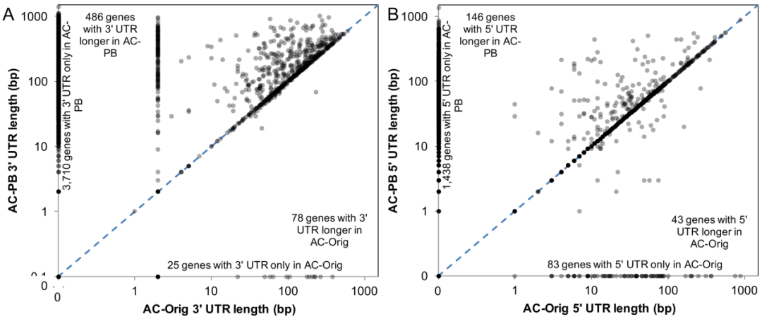 圖6 (A)3’UTR和(B)5’UTR的全長和RNA-seq之間UTR長度的差異