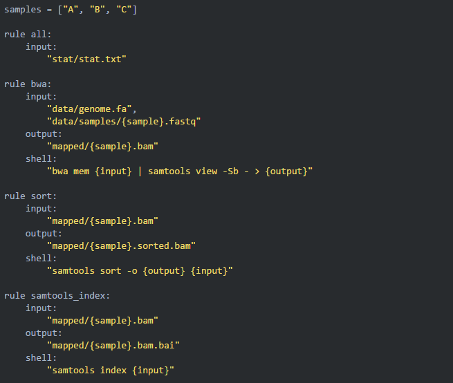 上面的 bwa 規(guī)則僅僅比對了一個樣本,可是實際項目中有幾十上百的樣本時,我們就不能這樣直接寫樣本名來運行了,這樣很不 pythonic。snakemake 允許使用通配符(wildcard)來批量運行命令,示例如下: