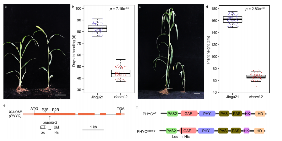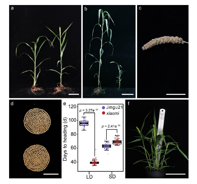 “小米”主要有以下特征:(1)表現(xiàn)出極早的開花表型:抽穗期39天(播種后天數(shù),DAS)左右,約70天內(nèi)完成了生命周期。而野生型(晉谷21,WT)的平均抽穗期約為82 天(DAS),成熟期為130 DAS(圖1b、c);(2)“小米”比野生型矮(圖1b),但結(jié)實率高12.83%,且種子大小沒有顯著差異(圖1d);(3)“小米”在短日(SD,10h光照/14h暗)條件下比長日(LD,16h光/8h暗)條件下的抽穗晚了約一個月,表明“小米”的早期抽穗依賴于LD條件(圖1e)。通過延長日長和優(yōu)化其他條件,可以將“小米”的生命周期縮短到65天,株高約為29厘米(圖1f),每年可以在成長室里完成5到6代。(4)僅需較小的種植面積,類似于種植等量的擬南芥植株。