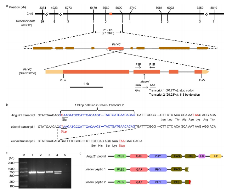 將“小米”基因組序列與經(jīng)基因組重測序生成的晉谷21基因組序列進行比較,發(fā)現(xiàn)在定位區(qū)域只存在一個突變——“小米”基因Si9g09200的編碼區(qū)從“G”到“T”的突變,該基因編碼一種假定的PHYC蛋白(圖2a)。在所檢測的77個早期抽穗F2個體中,均為T/T純合突變體。相比之下,在256個晚抽穗個體中,92個是G/G WT純合子,另外164個是G/T雜合子,反映了基因型和表型之間的完美關(guān)聯(lián)。這種突變產(chǎn)生了一個終止密碼子,形成一個截短的蛋白質(zhì),占該基因約71%的轉(zhuǎn)錄本(轉(zhuǎn)錄本1)(圖2a-d)。這一突變還導(dǎo)致了113 bp的移碼缺失的剪接,形成了占該基因約29%轉(zhuǎn)錄本(轉(zhuǎn)錄本2)的截短蛋白(圖2a-d)。根據(jù)預(yù)測,被截斷的蛋白質(zhì)缺少第二個PAS結(jié)構(gòu)域的三分之二(肽1)或三分之一(肽2),以及整個HK和HD域(圖2d)。