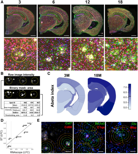 為了解基因表達的變化,作者進行了兩個差異表達分析。首先比較AppNL-G-F?和 C57BL/6(基因模型),其次是Aβ沉積對基因表達的影響(Aβ模型)。作者使用6個轉(zhuǎn)錄本進行經(jīng)典的RNA原位雜交實驗來驗證Aβ模型(圖2D&E),根據(jù)模型,18月齡的AppNL-G-F,Cst7,Cd68,C1qa,Slc1a3,Clu和Mbp表達異常。在圖2D中可以看到,ST的數(shù)據(jù)和RNA原位雜交數(shù)據(jù)高度相關(guān),這也證實了本方法的有效性。
