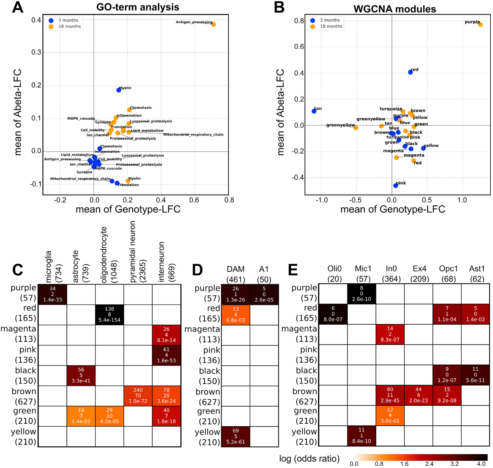 具有相似表達模式的基因很可能擁有相似的功能,因此可以通過加權(quán)基因共表達網(wǎng)絡(luò)分析(WGCNA)進行模塊聚類。作者研究了10327個轉(zhuǎn)錄譜中變化程度*大的50%的基因,識別出12個模塊,并使用GOrilla提取了可能的生物學(xué)功能、Aβ暴露的表達變化、3月齡和18月齡的基因型、細胞特征、受影響的腦區(qū)。