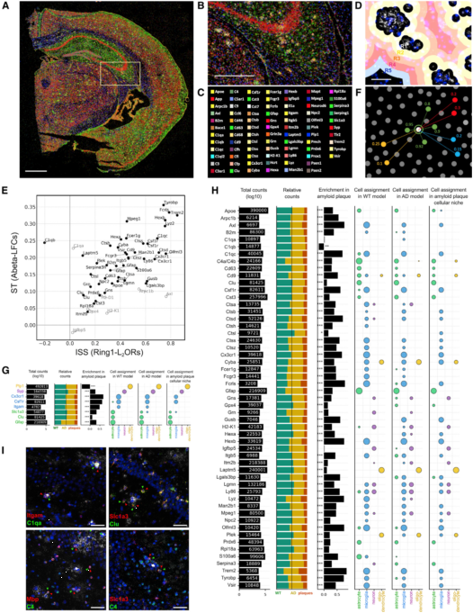 ST展示了淀粉樣蛋白斑周圍的多細胞反應(yīng),作者尋求一種正交獨立方法從單細胞分辨率下進行驗證。原位測序(ISS)可以在一個反應(yīng)中使用許多靶向特異的原位標簽。作者使用了特制的探針來繪制PIGs表達以及細胞類型標簽(Itgam、 Cx3cr1、Csf1r對應(yīng)小膠質(zhì)細胞;Slc1a3、Gfap 、Clu對應(yīng)星形膠質(zhì)細胞; Syp對應(yīng)神經(jīng)元; Plp1對應(yīng)少突膠質(zhì)細胞;圖4A-C)。ISS實驗中,對AppNL-G-F和兩只18月齡WT小鼠各構(gòu)建兩個文庫。用每個基因的熒光點數(shù)目來量化基因表達,并將熒光點聚類到淀粉樣蛋白斑周位的5個同心圓上(圖4D)。51/54個PIGs在圈1上明顯富集,而C1qb在圈1上明顯減少(圖4E)。ISS的結(jié)果與ST的結(jié)果線相關(guān)性非常好(圖4E)。