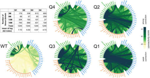 在WT中,所有PIGs的關(guān)聯(lián)相對較低,PIG被分為三個簇(圖5,綠、藍、橙)。ISS實驗(圖4H)證明了在綠色簇中,星形膠質(zhì)細胞基因(7/12)富集,而藍色(14/23)和橙色(14/28)簇聚集了小膠質(zhì)基因中表達的PIGs。在WT中,橙色的PIGs幾乎不關(guān)聯(lián),而AppNL-G-F小鼠中,在接觸增長的Aβ后,這些PIGs的基因被招募。隨著Aβ指標增長,PIGs內(nèi)部和相互之間的關(guān)聯(lián)增強。在Q4-Q1中,隨蛋白斑積累程度增加,互作關(guān)系明顯增加。