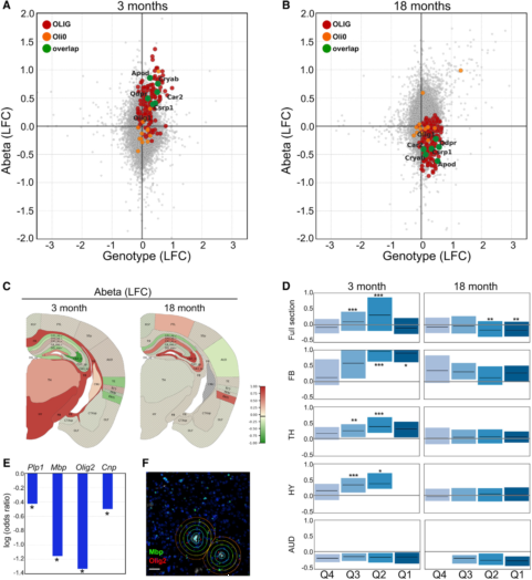 類似于髓鞘類(圖S3A),與3月齡和18月齡的WT小鼠相比,AppNL-G-F小鼠在OLIG模塊的基因型軸線全腦范圍上全部上調(diào)(圖6A&6B)。這種基因型效應(yīng)可能反映了小鼠大腦對人源和突變的App基因的整體反應(yīng)。但是,從基因型中把Aβ暴露(Aβ軸)分理出后,作者發(fā)現(xiàn)了一個OLIG模塊的有趣變化:在3個月時,全部呈正相關(guān),在18個月時為負相關(guān)(圖6A&6B)。在不同的大腦區(qū)域,這種反應(yīng)也有明顯的差異(圖6C)。比較圖2C中淀粉樣蛋白斑和OLIG表達,可以明顯發(fā)現(xiàn)OLIG表達的主要驅(qū)動因素不是Aβ指標而是大腦區(qū)域本身(圖6C)。在3月齡時,作者發(fā)現(xiàn)在纖維束(FB)、丘腦(TH)和下丘腦(HY)中顯著的OLIG-Aβ正相關(guān),而在內(nèi)嗅皮層(ENTI)和幾個海馬體皮層中存在顯著負相關(guān)。在18月齡時,作者在聽覺區(qū)域(AUDS)發(fā)現(xiàn)了OLIG-Aβ存在明顯負相關(guān),而在ENTI和海馬體中存在顯著正相關(guān)。