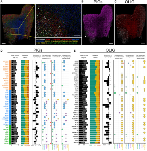作者使用3名AD患者和3名正常對照組死后的人腦樣本進行實驗。AD大腦處于淀粉蛋白斑C階段和神經(jīng)元糾纏V-VI階段的疾病進展期。研究描繪了與AD相關(guān)的額上回組織譜,總共報告了222個基因表達譜,包括45個人PIGs同源序列,OLIG模塊中42個斑塊反應(yīng)基因的同源序列,以及一系列細胞類型Marker。這些細胞Marker很好地在細胞分辨率下描繪了大腦區(qū)域(圖7A)。PIG模塊(圖7B,紫色)和OLIG模塊(圖7C,紅色)基因如預(yù)期的在大腦灰質(zhì)和白質(zhì)中富集。