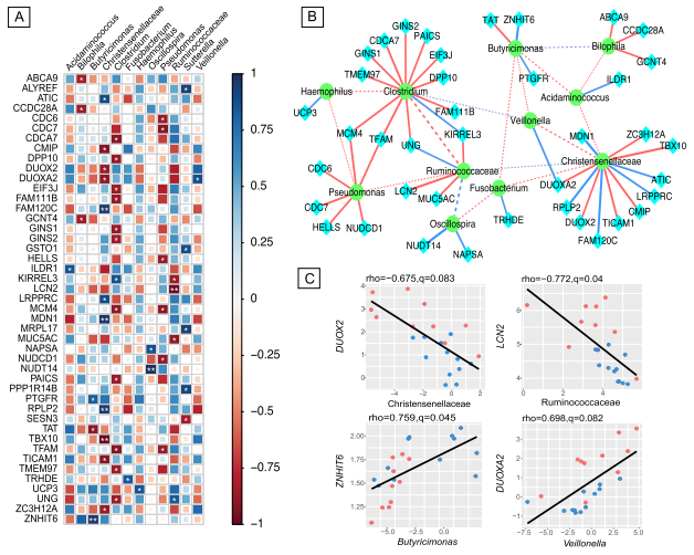 作者發(fā)現(xiàn)與健康對(duì)照相比,囊性纖維化患者的結(jié)腸中有1543個(gè)基因(CFTR)差異表達(dá)。這些基因富集于胃腸道和結(jié)直腸癌相關(guān)功能,如結(jié)直腸癌的轉(zhuǎn)移、腫瘤抑制、p53、mTOR信號(hào)通路等。囊性纖維化患者腸道菌群多樣性下降,產(chǎn)丁酸菌(Ruminococcaceae 和?Butyricimonas)減少,其他菌(Actinobacteria and Clostridium)豐度增加。結(jié)直腸癌相關(guān)基因(LCN2DUOX2)的表達(dá)與結(jié)直腸癌相關(guān)細(xì)菌(Ruminococcaceae 和Veillonella)豐度相關(guān)。