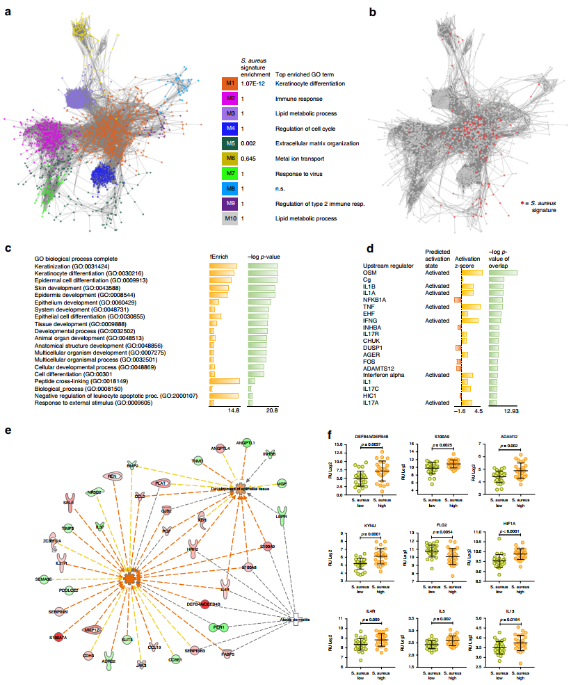 本文通過(guò)16S RNA測(cè)序、宏基因組測(cè)序及轉(zhuǎn)錄組測(cè)序技術(shù)研究了特異性皮炎和銀屑病患者皮膚微生物群落結(jié)構(gòu)以及皮膚基因表達(dá)模式。發(fā)現(xiàn)特異性皮炎和銀屑病與健康對(duì)照皮膚微生物組成存在顯著差異。特異性皮炎以金黃葡萄球菌為主并與宿主皮膚屏障功能、色氨酸代謝和免疫激活相關(guān)。銀屑病皮膚微生物群落與宿主基因表達(dá)存在微弱的關(guān)聯(lián)性。并為皮膚生態(tài)失調(diào)的生物標(biāo)志物和靶向治療提供基礎(chǔ)。
