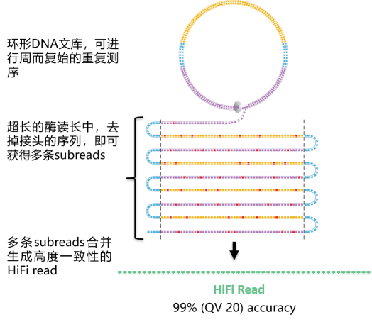 HiFi reads(High Fidelity reads)是2019年由PacBio推出的基于環(huán)化共有序列(Circular Consensus Sequencing,CCS)模式產(chǎn)生的既兼顧長讀長(10-20kb的長度)又具有高精度(>99%z確率)的測序結果。