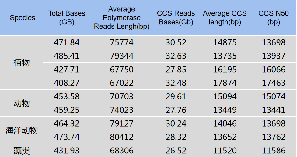 百邁客自2019年引進PacBio SequelⅡ平臺以來,在HiFi測序方面已經(jīng)積累了大量的經(jīng)驗,在技術人員的不斷優(yōu)化下,HiFi文庫單cell產(chǎn)出更是有了新的突破,下面跟大家分享一下部分HiFi文庫產(chǎn)出情況(表2)。在統(tǒng)計近1個月的HiFi cell中,我們單cell平均產(chǎn)出達416Gb。其中,單cell產(chǎn)出達400 Gb以上的占比達68%,同時,單cell的HiFi reads數(shù)據(jù)量高達32 Gb,占原始產(chǎn)出的比例*高可達7.96%。在讀長方面,平均酶讀長已超70Kb,HiFi reads長達18Kb。