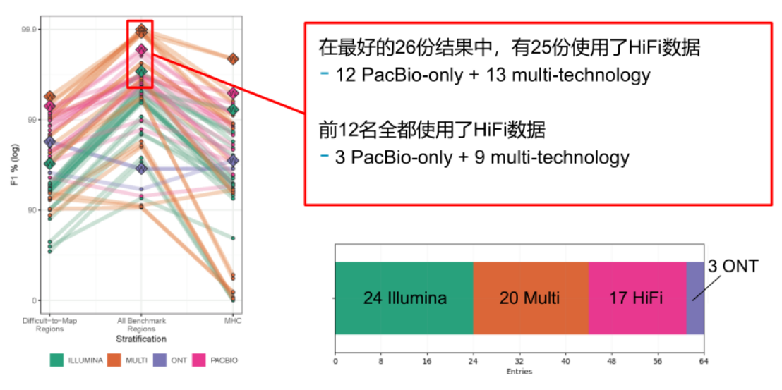 基因組測序中重要的自然是z確率,只有保證較高的z確率,基因組的研究才有價值。下圖展示了最近的PrecisionFDA 真實挑戰(zhàn)賽V2的結果(圖6),在單一技術參賽結果中,使用PacBio HiFi數(shù)據(jù)(粉紅色)在所有類別中,無論是全基因組范圍(“所有基準區(qū)域”),還是在難以映射的區(qū)域或是主要的組織相容性復合體(MHC)中均提供了較高的z確性。所有的多技術參賽結果(橙色)中都使用了PacBio HiFi數(shù)據(jù)[2]。