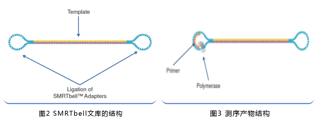 bell即“鈴”的意思,如圖2,構建完成的bell文庫形狀就如同一個啞鈴。其主要組成部分是:發(fā)卡狀的接頭(Hairpin Adapter)和雙鏈DNA模板(Double Stranded DNA Template)。而文構建完成后、測序前還需要完成bell文庫、Sequencing Primer、DNA Polymerase的混合工作(測序引物退火結合bell文庫,然后引物-bell文庫復合物結合DNA聚合酶)。最終產(chǎn)物如圖3所示。