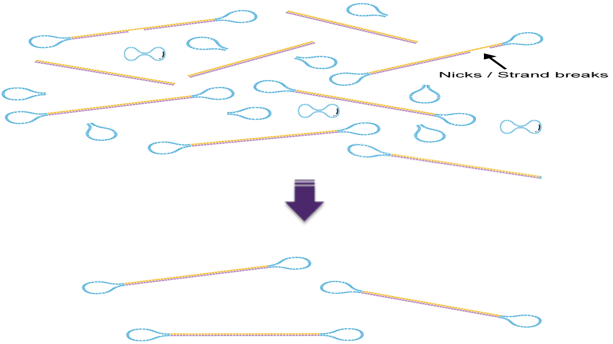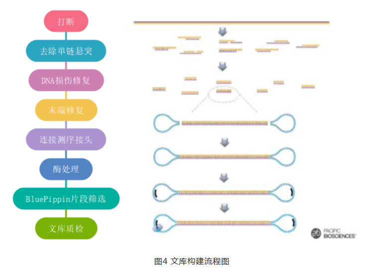以基因組HiFi文庫為例(15-20K文庫)(圖4)。當?shù)玫絞DNA后,先利用G-tube管或Megaruptor System將基因組片段化至合適大小,而后通過去除單鏈懸突、損傷修復和末端修復等步驟,得到完整的雙鏈插入片段。接下來,通過將接頭連接至雙鏈DNA來創(chuàng)建SMRTbell文庫,從而得到環(huán)狀模板。完成接頭連接后,需要對連接產(chǎn)物進行純化,利用酶處理(圖5)來消化線性或內(nèi)部損傷環(huán)形DNA分子(游離的Hairpin Adapter、兩端未連接Adapter的DNA模板、已成環(huán)但內(nèi)部有損傷的DNA模板),酶處理完畢后,一般會利用Bulepippin或Sage ELF System切膠回收目標大小范圍內(nèi)的文庫。