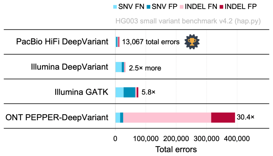 另外,由下圖可以看出(圖7),Google DeepVariant使用HiFi數(shù)據(jù)提交的結果在所有單一技術檢測全基因組范圍內(nèi)的變異z確性*高,對SNV√確度和召回率可以達到99.9%,對插入缺失的√確度和召回率可以達到99.4%[2]。