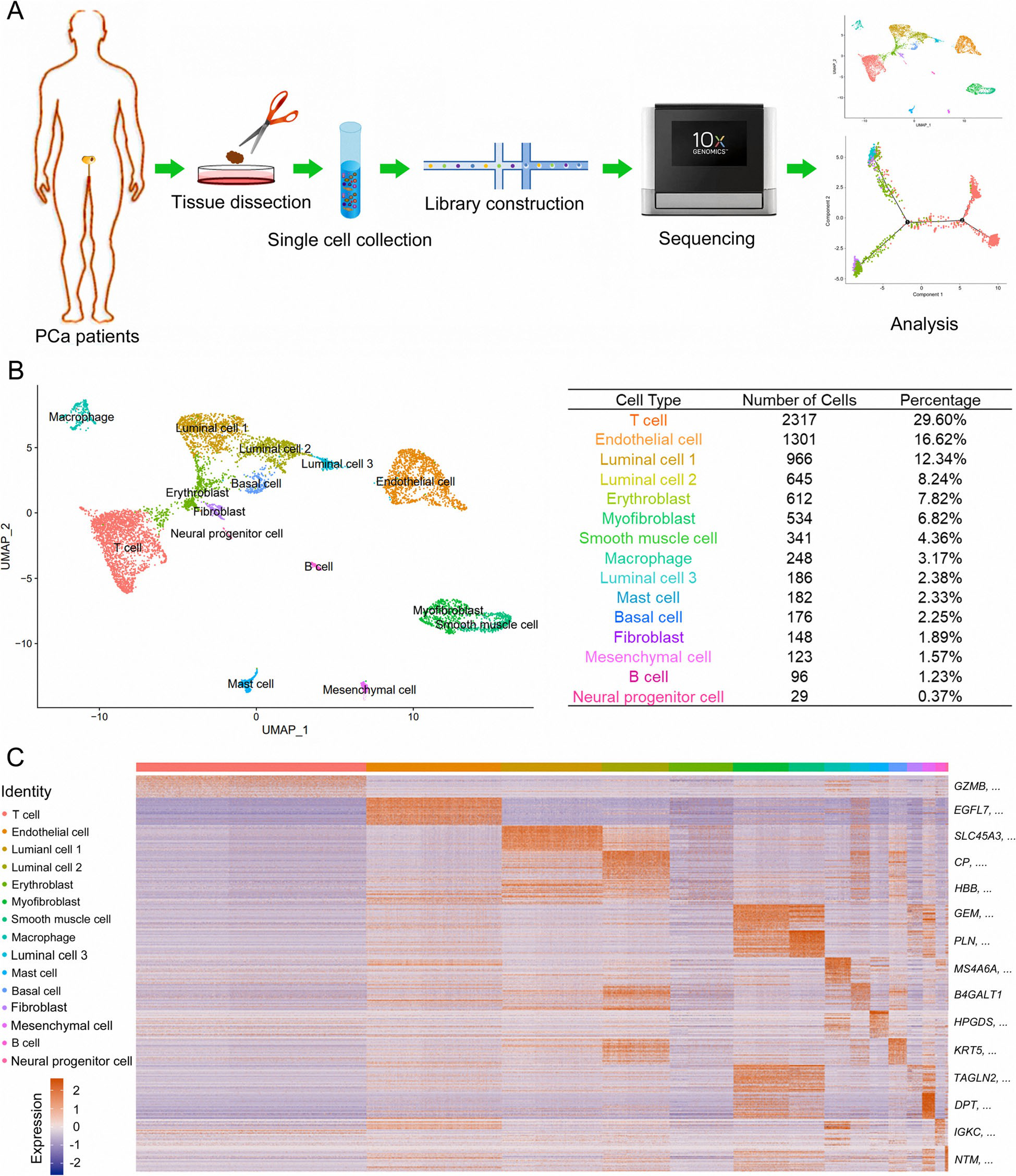 兩名患者通過前列腺組織中AMACR的過度表達和TP63的缺失表達被診斷為PCa。收集兩名患者的癌樣,解剖并消化成單個細胞,用10×基因組學(xué)進行scRNA-seq(圖1a)。共有7904個合格細胞用于進一步分析。通過PCA對所有細胞進行無偏聚類,UMAP可視化細胞成分(圖1b)。通過DEG分析確定了15個主要簇的特征基因:T細胞、內(nèi)皮細胞、1型管腔細胞、2型管腔細胞、紅細胞、肌成纖維細胞、平滑肌細胞、巨噬細胞、3型管腔細胞、肥大細胞、基底細胞、成纖維細胞、間充質(zhì)細胞、B細胞和神經(jīng)內(nèi)分泌細胞(圖1c)。