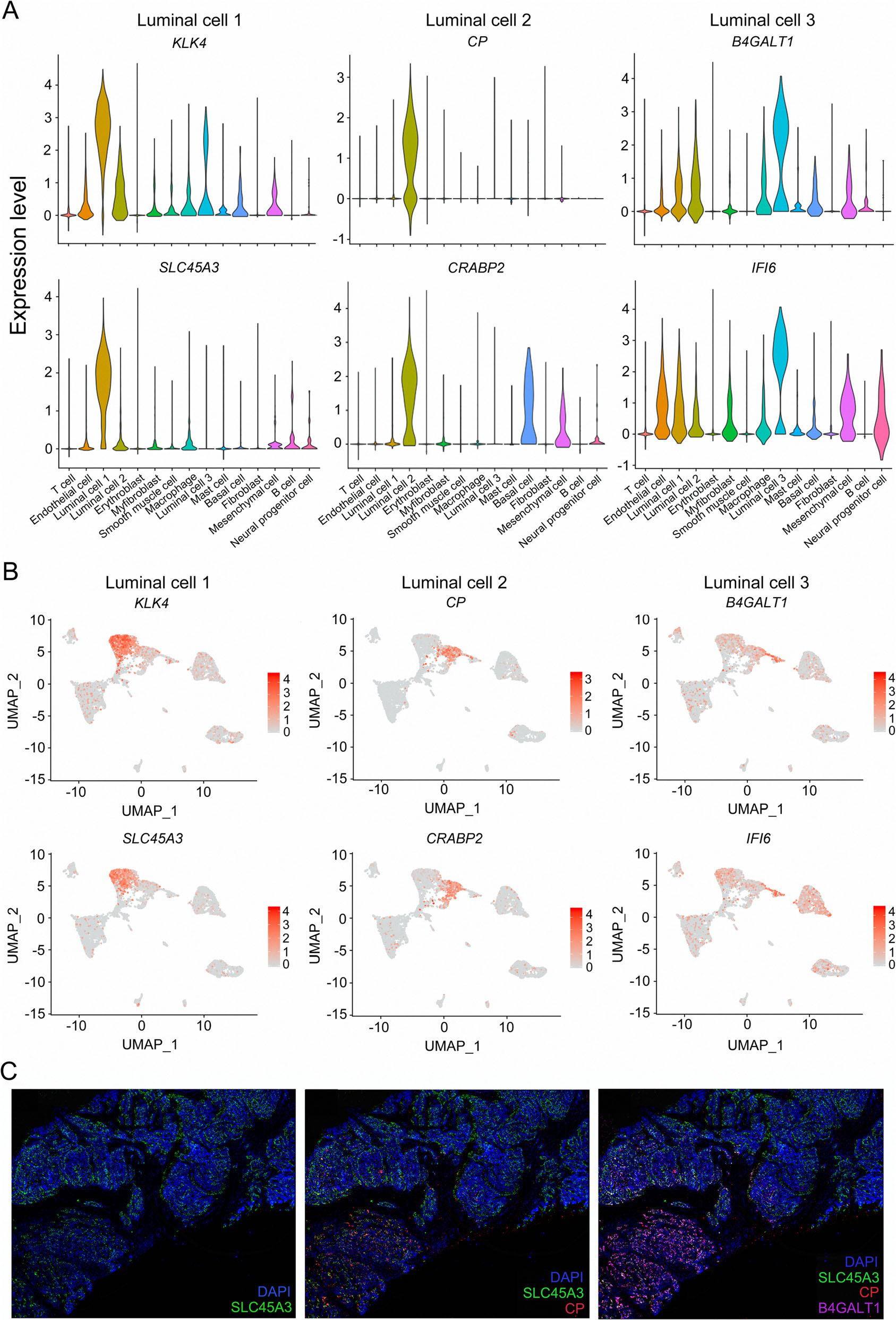 在本文的數(shù)據(jù)中,根據(jù)管腔標(biāo)志物在PCa樣本中的高表達水平,確定了3種類型的管腔細胞,包括角蛋白8(KRT8)和角蛋白18(KRT18)。為了表征這些管腔簇,作者用VlnPlot和FeaturePlot分別檢測了各自標(biāo)記基因的表達模式。結(jié)果表明,這些溶解酶(k4a)可作為特異性的載體(k4a)表達于細胞內(nèi)(k4a4)。銅藍蛋白(CP)在2型管腔細胞中唯一表達,而細胞維甲酸結(jié)合蛋白2(CRABP2)在間充質(zhì)細胞以及2型和3型管腔細胞中高表達,這表明CP更適合2型管腔細胞(圖2a,b)。與其他簇相比,3型管腔細胞表現(xiàn)出更高水平的β-1,4-半乳糖基轉(zhuǎn)移酶1(B4GALT1)和干擾素α誘導(dǎo)蛋白6(IFI6)的表達水平,表明B4GALT1和IFI6可以識別這些細胞(圖2a,b)。為了研究PCa組織中每種類型管腔細胞的細胞學(xué)定位,我們使用抗SLC45A3、抗CP、抗B4GALT1抗體進行免疫染色,并用DAPI復(fù)染組織切片(圖2c)。SLC45A3在前列腺組織的大多數(shù)管腔細胞中表達(圖2c)。相反,在一小部分管腔細胞中檢測到低表達水平的SLC45A3(圖2c)。不同類型的癌細胞在T1區(qū)的發(fā)育不完全相同(圖2 c)。