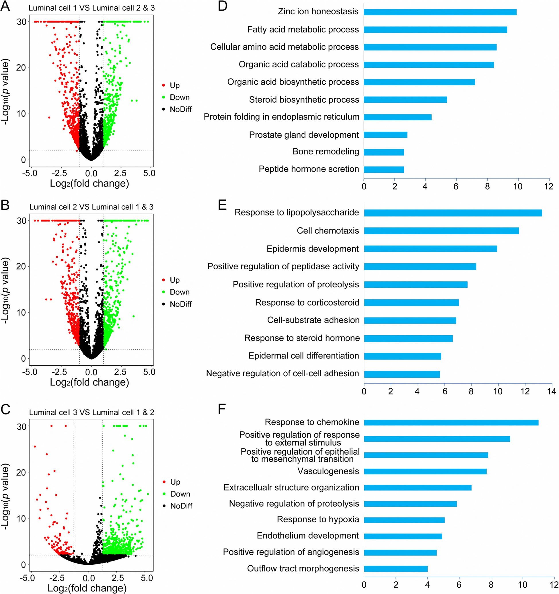 為了進一步確定每個管腔簇在PCa發(fā)生和發(fā)展中的潛在作用,作者進行了功能增強。1型管腔細胞上調(diào)的基因主要富集于參與癌癥進展的代謝過程,如脂肪酸代謝過程、甾體生物合成過程和肽類激素分泌,表明1型管腔細胞確實是惡性細胞(圖3a,d)。2型細胞中蛋白水解酶和胞漿蛋白水解活性均為陽性,提示細胞內(nèi)蛋白水解活性和2型細胞的高表達有關(guān)。有趣的是,2型管腔細胞中其他高表達的基因在正常前列腺發(fā)育過程中豐富,包括表皮發(fā)育、表皮細胞分化和對類固醇激素的反應(yīng)(圖3b,e)。綜合起來,2型管腔細胞被鑒定為惡性程度相對較低的細胞。為了進一步驗證這一觀點,我們對從成對比較中獲得的每個亮度DEG進行GO分析,并得到類似的結(jié)果。在3型管腔細胞中表達的上調(diào)基因主要參與腫瘤遷移相關(guān)的過程,如血管生成、上皮-間質(zhì)轉(zhuǎn)換的正調(diào)控和內(nèi)皮細胞的發(fā)育,表明3型管腔細胞也是惡性細胞(圖3c,f)。