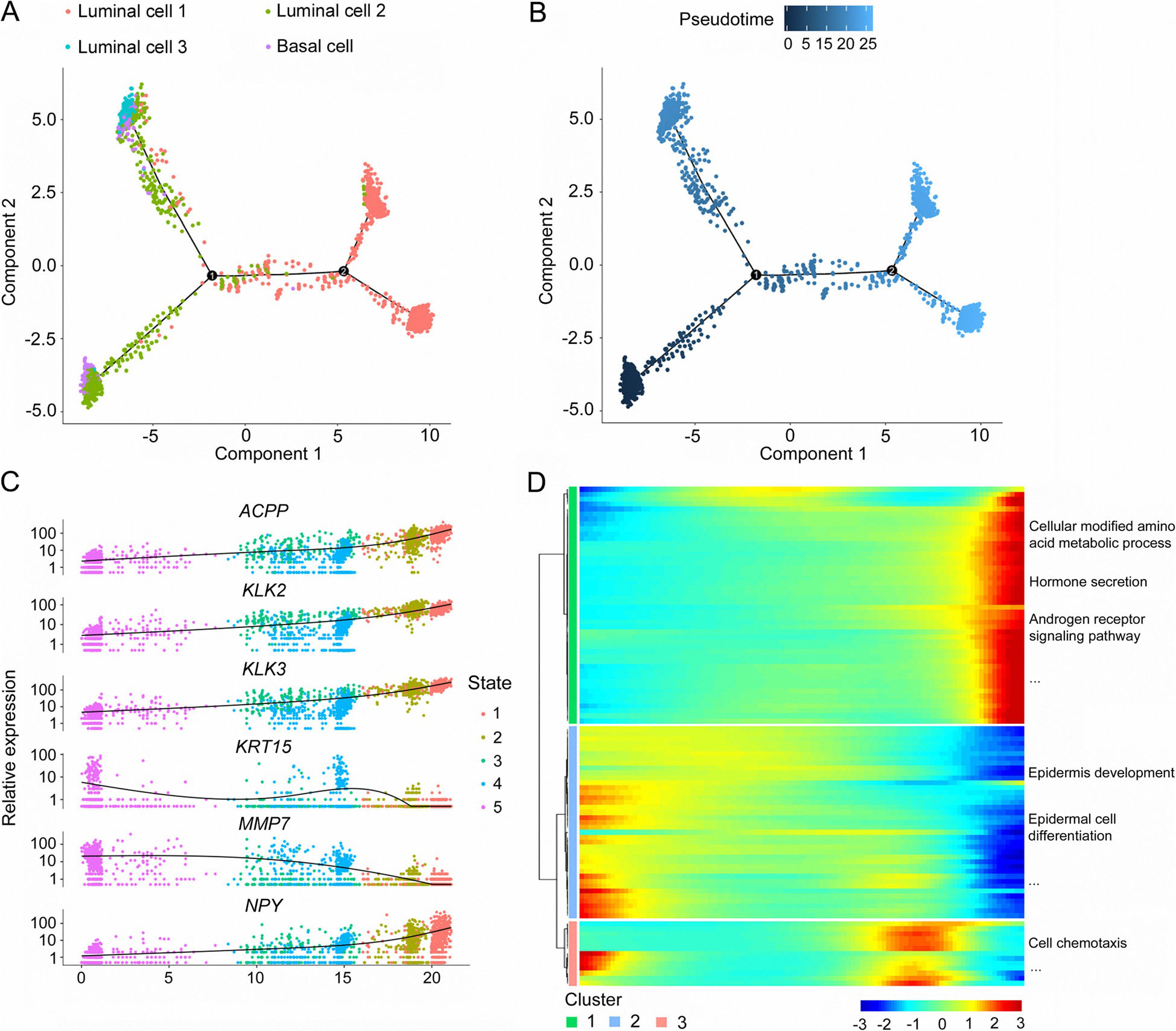 作者進一步分析了基因沿軌跡的動態(tài)表達變化,以確定PCa進展的關(guān)鍵基因。表達變化最顯著的基因包括:酸性磷酸酶、前列腺(ACPP)、激肽釋放酶相關(guān)肽酶2(KLK2)、KLK3、角蛋白15(KRT15)、基質(zhì)金屬肽酶7(MMP7)和NPY(圖4c)。此外,作者對前100個基因進行了擬時間表達模式的聚類分析,并分析了每個簇的功能豐富程度。聚類1中的基因高度表達于終末期,主要富集于PCa起始和進展相關(guān)的過程,包括細胞修飾的氨基酸代謝過程、激素分泌和AR信號通路(圖4d)。第二類基因在前列腺發(fā)育初期表現(xiàn)出高表達水平,主要參與表皮發(fā)育和表皮細胞分化,提示其在前列腺正常發(fā)育中的潛在作用(圖4d)。聚類3中的大多數(shù)基因在假時間軌跡的中間階段表達增加,并在細胞趨化性中富集(圖4d)。