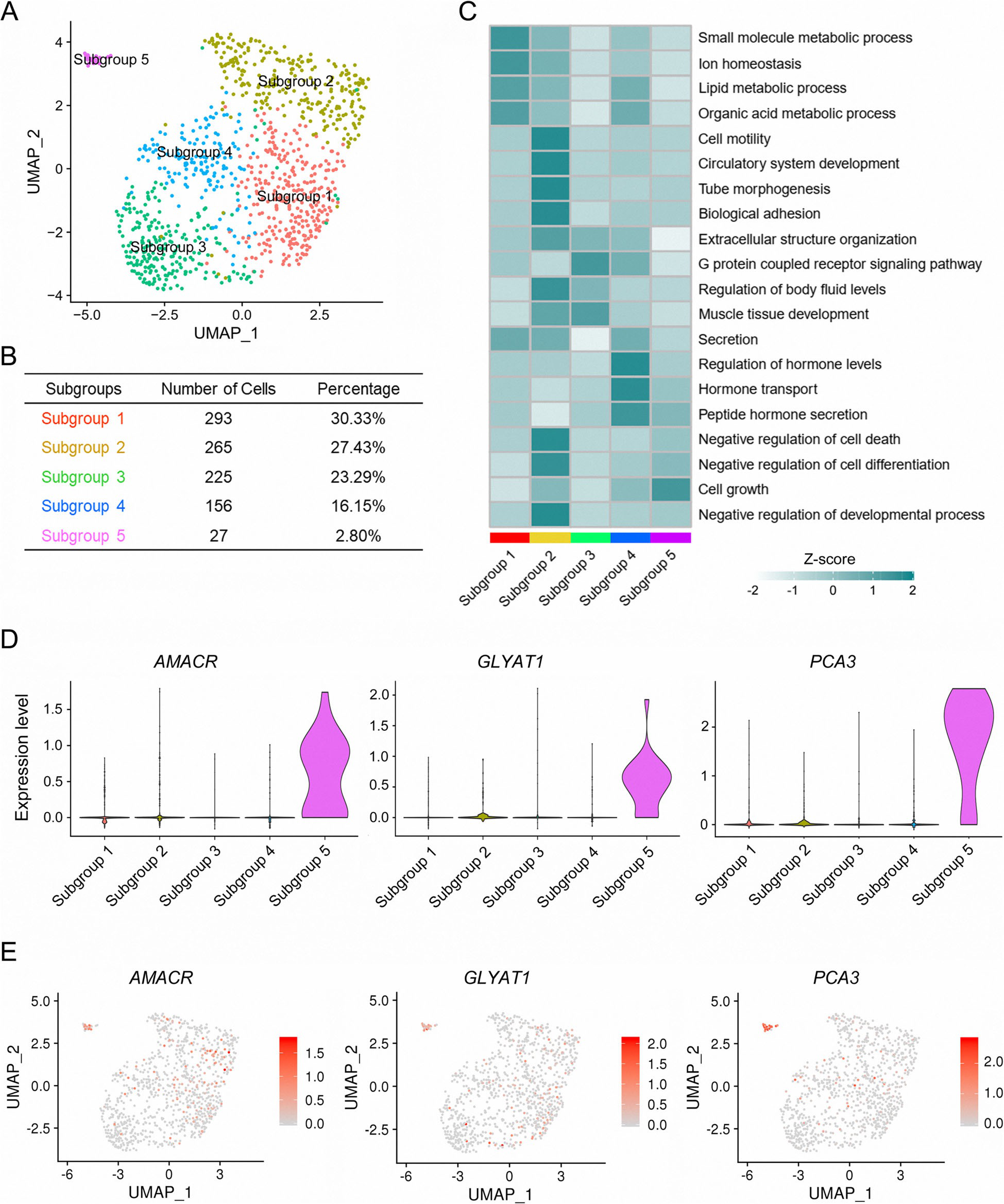 作者首先分析來自TCGA的公共PCa患者中每個管腔標(biāo)志基因的表達水平,以檢驗它們與PCa發(fā)生和發(fā)展的臨床相關(guān)性。相比之下,大多數(shù)1型管腔標(biāo)記基因在惡性程度較低的前列腺癌中的表達高于惡性程度高或正常前列腺,這表明在前列腺癌的發(fā)生和早期發(fā)展中有潛在的作用(補充圖5)。因此,作者對1型管腔細胞進行了亞聚類,以確定引起PCa的亞群。PCA將1型管腔細胞分為5個亞組(圖5a,b)。分析每個亞組標(biāo)記基因的功能富集,亞組1與腫瘤細胞有絲分裂準(zhǔn)備所必需的生物分子代謝過程有關(guān),如脂質(zhì)代謝過程和有機酸代謝過程(圖5c)。與其他亞組相比,亞組2與細胞運動、管形態(tài)發(fā)生和細胞死亡負調(diào)控有關(guān),這些過程對腫瘤的遷移和生長至關(guān)重要(圖5c)。亞組3主要參與G蛋白偶聯(lián)受體信號通路和肌肉組織發(fā)育(圖5c)。第4亞組與PCa相關(guān)的過程,包括激素水平的調(diào)節(jié),激素轉(zhuǎn)運和肽激素轉(zhuǎn)錄(圖5c)。相比之下,第5亞群的獨特功能主要集中在細胞生長(圖5c)。VlnPlot和特征圖顯示,AMACR、甘氨酸鈉基轉(zhuǎn)移酶樣1(GLYATL1)和PCA3在5亞組中特異表達(圖5d,e)。有趣的是,AMACR是一種在前列腺癌中高度表達的過氧化物酶體酶,參與支鏈脂肪酸和膽汁酸中間產(chǎn)物的β-氧化,對PCa的發(fā)生和發(fā)展至關(guān)重要。PCA3是一種非編碼RNA,在PCa細胞系、原發(fā)組織甚至PCa患者尿液中高表達。這兩個5亞組的標(biāo)記物已經(jīng)被用于PCa的診斷和分層,這意味著5亞組可能是臨床上PCa診斷和分層所必需的一組不同的細胞。