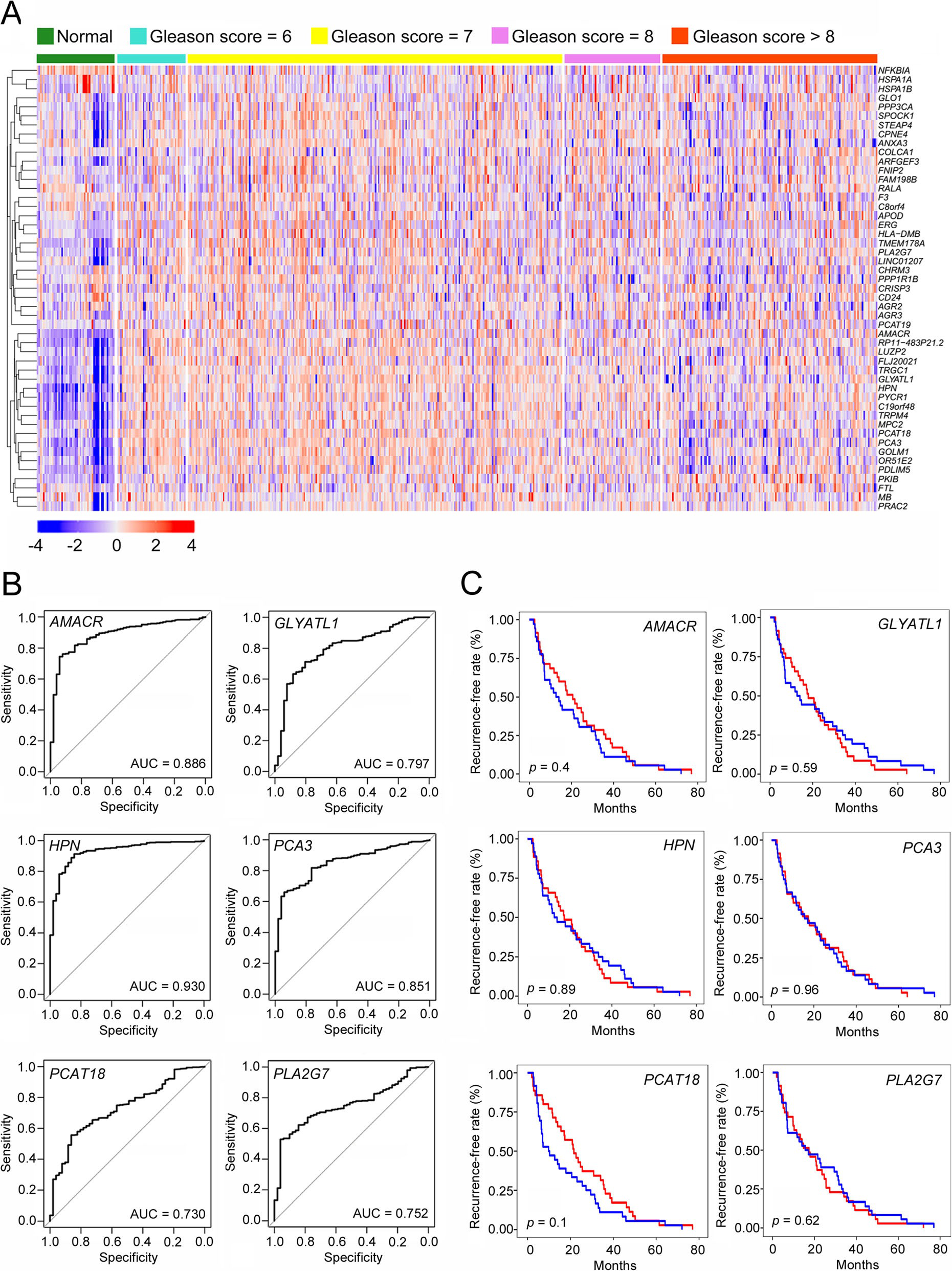 分析TCGA患者Ⅰ型管腔亞群的臨床相關(guān)性及其標(biāo)記基因的表達模式。正常前列腺中大多數(shù)1-4亞組標(biāo)記基因的表達水平與PCa組織中的相似甚至更高。相比之下,第5亞組的標(biāo)記基因在PCa組織中高表達,尤其是在Gleason評分為6或7的患者中,這表明在PCa的發(fā)生和早期發(fā)展中有潛在的作用(圖6a)。通過ROC分析,我們進一步鑒定了5亞組中6個特異性和敏感性最高的標(biāo)記基因,包括AMACR、GLYATL1、HPN、前列腺癌基因PCA3,前列腺癌相關(guān)轉(zhuǎn)錄物18(PCAT18)和磷脂酶A2第七組(PLA2G7)(圖6b)?;?-基因集的ROC分析顯示了很強的PCa預(yù)測能力,AUC得分為0.937。此外,這些基因的表達模式不僅區(qū)分了PCa與正常前列腺,而且區(qū)分了早期PCa(Gleason評分=6)和高度惡性PCa(Gleason評分≥8)。許多PCa患者在1-2年內(nèi)表現(xiàn)出抗藥性,并復(fù)發(fā)為晚期PCa,如CRPC。第5亞組可能有助于PCa復(fù)發(fā)。然而,Kaplan-Meier分析顯示,這些基因在生化復(fù)發(fā)中沒有明顯的預(yù)測能力,無論是單獨的還是作為一個基因集(圖6c)??傊?亞組的惡性細胞是PCa診斷和分層的關(guān)鍵,但與生化復(fù)發(fā)無關(guān)。