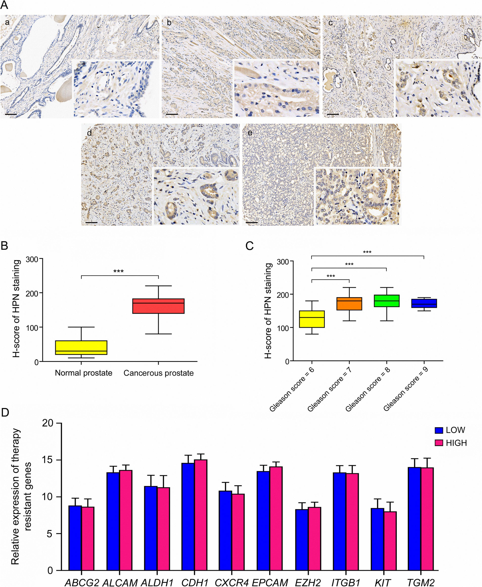 不同病理分級的癌組織之間(圖7a)。為了檢驗強度差異作者進一步用Hscore分析免疫染色評分,發(fā)現(xiàn)HPN在癌組織中的表達水平顯著增強(圖7b)。此外,高病理分級(Gleason評分=7,8,9)的腫瘤組織中HPN的表達水平顯著高于病理分級較低(Gleason評分=6)(圖7c)。因此,作者認為HPN可能是臨床PCa診斷和分層更為特異、敏感的生物標(biāo)志物。為了探討HPN在預(yù)測PCa復(fù)發(fā)中的作用,作者根據(jù)HPN的表達水平將TCGA患者分為低和高兩組,然后分析了治療依從性標(biāo)記物的表達,包括ATP結(jié)合盒亞家族G成員2(ABCG2)、醛脫氫酶1(ALDH1)、受體酪氨酸激酶(KIT)的表達,活化白細胞粘附分子。