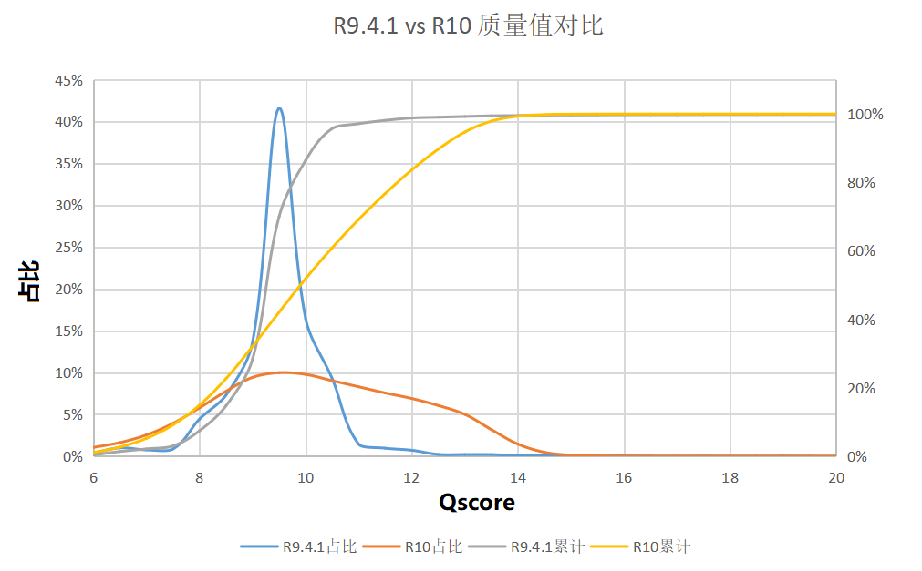 圖1 同一樣本R9.4.1 vs R10 原始產(chǎn)出質(zhì)量值對(duì)比