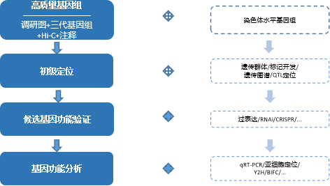 遺傳圖譜是目前經(jīng)典的功能基因定位策略,主要基于高通量測序技術(shù)開發(fā)單核苷酸多態(tài)性位點(diǎn)(SNP),并計(jì)算多態(tài)性標(biāo)記間的遺傳連鎖距離,構(gòu)建高密度遺傳圖譜,最后結(jié)合性狀調(diào)查對目標(biāo)區(qū)域進(jìn)行定位。數(shù)量性狀基因座(quantitative trait locus,QTL)是指基因組中引起數(shù)量性狀變異的座位。作物的產(chǎn)量、質(zhì)量、株型、生長發(fā)育等大多數(shù)重要經(jīng)濟(jì)性狀及農(nóng)藝性狀通常都為數(shù)量性狀。利用分子標(biāo)記,通過連鎖分析進(jìn)行QTL定位,是遺傳學(xué)中研究數(shù)量性狀相關(guān)功能基因的基本手段和確定分離并分離目標(biāo)基因的前提。而優(yōu)質(zhì)的基因組才能為性狀精準(zhǔn)定位提供有力支持。