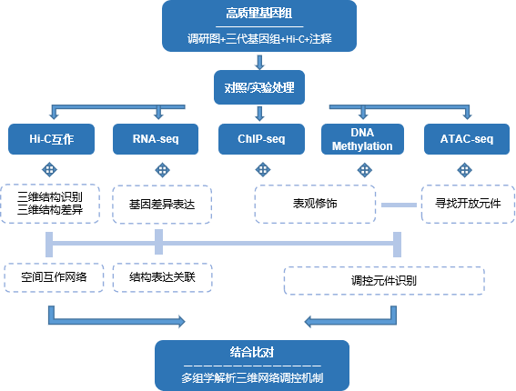 表觀遺傳(epigentics) “epi”表示“其上”或“超越”,genetics只設(shè)計(jì)基因的結(jié)構(gòu)層次,而epigenetics則涉及基因如何發(fā)揮其功能以及基因間的互作關(guān)系。基因組結(jié)合表觀調(diào)控可更加深入的剖析物種在何時(shí)、何地、以何種方式去應(yīng)用遺傳信息的指令。多種表觀遺傳研究手段間可相互組合,從三維基因、修飾表達(dá)、調(diào)控元件等多種層面解析不同調(diào)控原理。