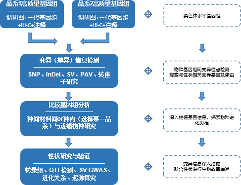 對于大部分動(dòng)植物,其測序主要基于單一品種作為參考基因組。單一基因組測序通常只能覆蓋基因組的80%~90%,且通常只有代表馴化的優(yōu)良品種的單一基因型能夠被準(zhǔn)確檢測到,因此不同生態(tài)型重測序數(shù)據(jù)一般只有50%~80%能比對到參考基因組上。而通過對兩種品系基因組進(jìn)行denovo(或者與已發(fā)表品系進(jìn)行研究),充分比較其間的基因組變異信息,可以更好的對不同生態(tài)型進(jìn)行表型功能差異分析。結(jié)合兩種生態(tài)型品種雜交子代圖譜,將極大的利于后續(xù)性狀與功能研究。與動(dòng)物相比植物更具有品種多樣性,因此該研究方案目前更多的應(yīng)用于植物材料中。