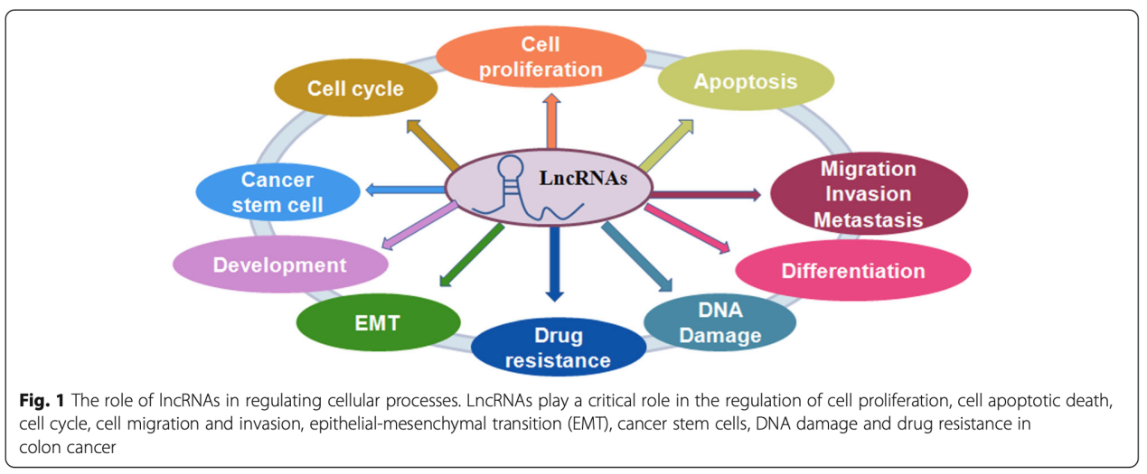 越來越多的證據(jù)表明,lncRNA在結(jié)腸癌的發(fā)生和發(fā)展中起著至關(guān)重要的作用,一項(xiàng)研究使用TCGA數(shù)據(jù)集的RNA測序數(shù)據(jù)在結(jié)腸腫瘤中鑒定了大約200個(gè)差異表達(dá)的lncRNA。LncRNA與患者預(yù)后,細(xì)胞增殖,細(xì)胞凋亡,細(xì)胞轉(zhuǎn)移和侵襲,細(xì)胞周期,上皮-間質(zhì)轉(zhuǎn)化(EMT),癌癥干細(xì)胞(CSC)和耐藥性相關(guān)(圖1)。
