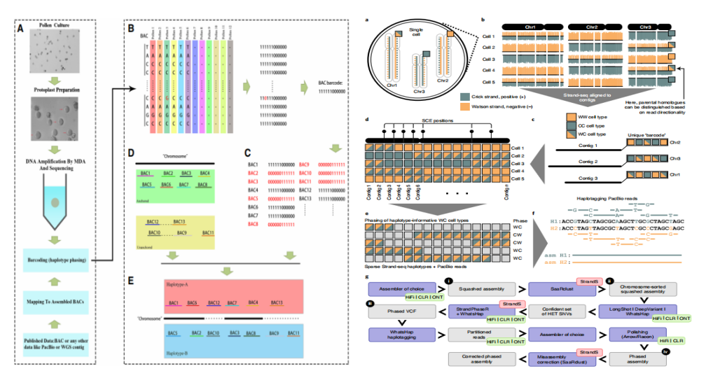 Bar-coding:將花粉單細胞結合構建的人工染色體(BAC,artificialchromosome)進行單倍型分型。Strand-seq:短reads結合單細胞通過胸苷類似物選擇性標記去除一條DNA鏈,并可與長reads測序數據結合使用來完成單倍型分型。