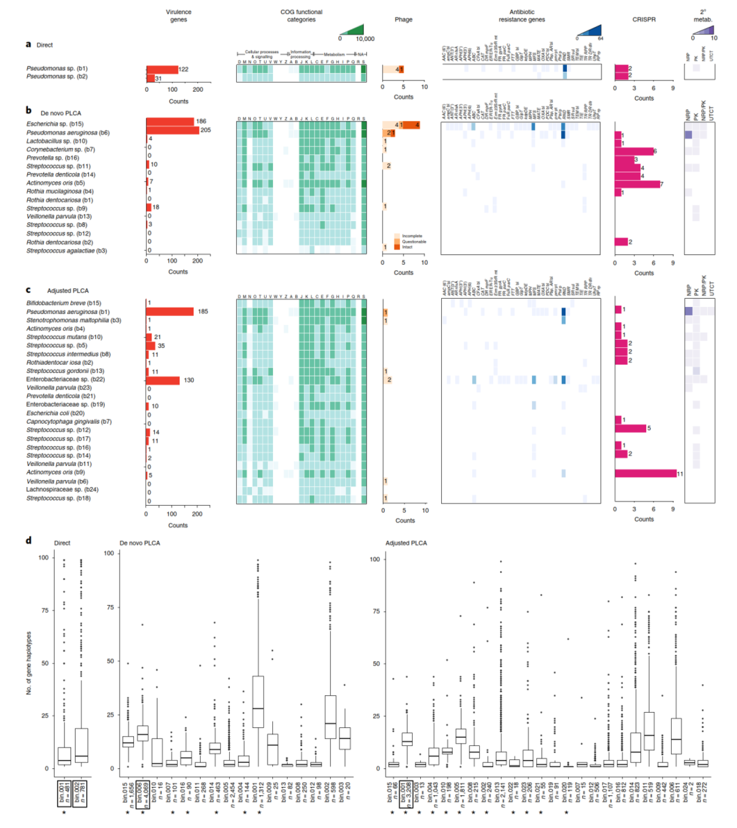 通過富集培養(yǎng)獲得的分類學多樣性的增加直接轉化為該微生物群落功能信息的增加(圖6)。富集培養(yǎng)測序在直系同源蛋白簇(COGs)、毒力基因、抗生素抗性基因、CRISPRs和次級代謝功能方面獲得更大的多樣性和功能鑒定數(shù)量。先前的研究已經(jīng)證實囊性纖維化氣道以及整個人類微生物群中存在單一物種的異質(zhì)性群體。作者通過鑒定基因單倍型來計算每個宏基因組bin的遺傳變異性(圖6d)。在一些宏基因組bins中,作者鑒定到一個一致的和少量的基因單倍型,表示這個bin代表一個單一的基因組群體(即一個菌株)。在大多數(shù)bins中,作者觀察到大量的單倍型多樣性,指示異質(zhì)性群體,即多菌株。不出所料,這些區(qū)域中每個基因的單倍型數(shù)量是多種多樣的,這表明細菌基因組內(nèi)進化壓力的已知范圍。平均而言,假單胞菌屬種中鑒定出更多的基因單倍型,富集培養(yǎng)的bins比直接測序更多。然而,直接測序鑒定了大量的普遍存在的單倍型基因離群值。Bin的完整性與平均單倍型頻率沒有相關性。