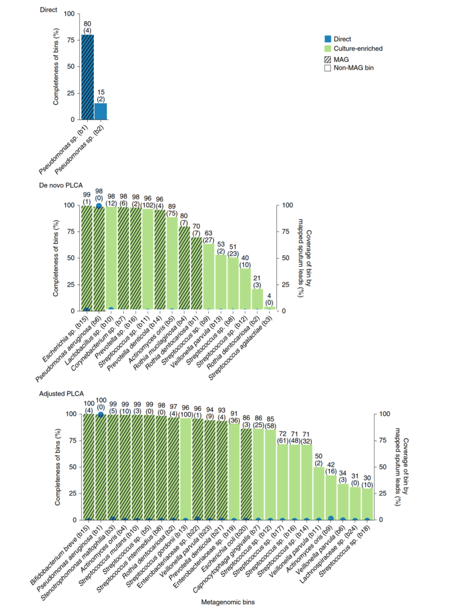 作者將擴增子測序與富集培養(yǎng)宏基因組測序相結合研究人類微生物群落。以肺囊性纖維化為例,平均培養(yǎng)了82.13%的可操作分類單元(OTUs),占痰液樣本直接測序所鑒定的相對豐度的99.3%,更重要的是,與直接測序相比,富集培養(yǎng)方法鑒定的OTUs多了63.3%。作者開發(fā)了平板覆蓋算法(PLCA),以確定富集培養(yǎng)平板的代表性子集,從而在該子集上進行宏基因組研究。與不依賴培養(yǎng)的方法相比,可以恢復更多的物種多樣性(包含更好的低豐度物種的組裝基因組,MAGs),更長的重疊群和更好的功能注釋結果。PLCA算法也可以應用于此前發(fā)布的腸道菌群數(shù)據(jù)集,富集培養(yǎng)分子圖譜可以更好的了解微生物菌群在人類健康和疾病中的作用。