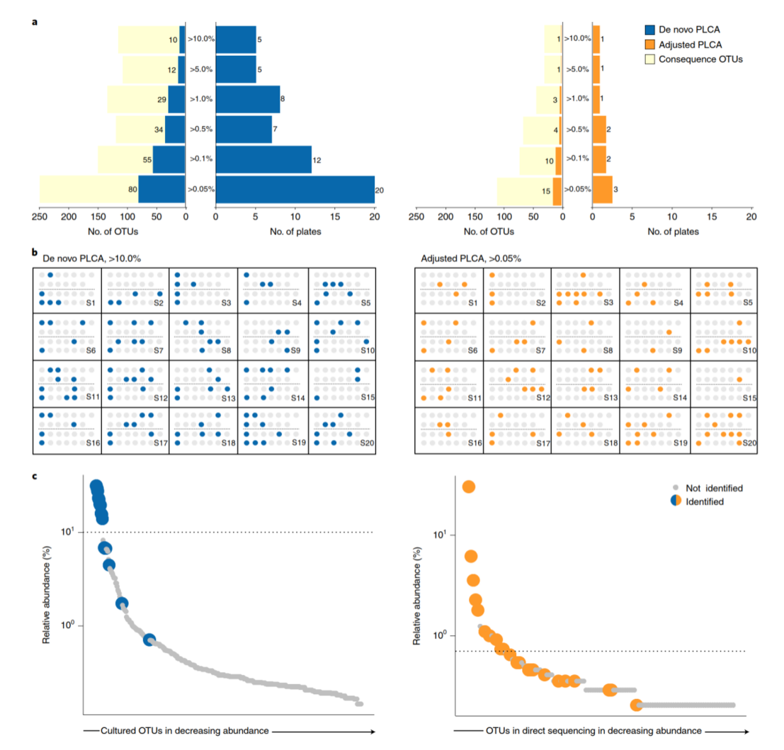作者采用了PLCA算法,來決定需要進行富集培養(yǎng)宏基因組測序的最小樣品數(shù),算法對任何含有大部分可培養(yǎng)富集的菌群生態(tài)均適用。PLCA算法有兩個版本,從頭 PLCA不依賴于直接測序結果再現(xiàn)富集培養(yǎng)菌群,而校正PLCA側重于直接測序結果中OTU的修復,這取決于是否都對原始樣品的菌群組成感興趣。采用這兩種算法,數(shù)據(jù)集凸顯了不同樣本的獨特性:從頭PLCA顯示,每個樣本具有獨特的平板集,并且每個培養(yǎng)條件對每個樣本都是必要的;校正PLCA顯示對數(shù)據(jù)集中樣本進行富集培養(yǎng)宏基因組測序是很有必要的(圖4a,b)。