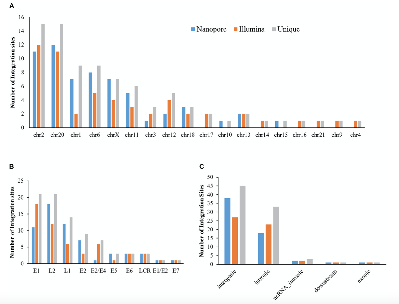 經(jīng)過驗證的整合位點顯示了不同的共存情況。Nanopore和Illumina整合位點數(shù)據(jù)集中共存在八個,表明這兩個平臺的檢測pipeline與先前發(fā)布的pipeline相比具有優(yōu)勢。在這三個數(shù)據(jù)集中,有9個整合位點的識別reads超過10個,并且在所有三個數(shù)據(jù)集中,有4個整合點的reads少于10個。整合位點的高驗證率(92.86%)也表明整合位點的檢測準確性很高。此外,內(nèi)含子區(qū)域中有四個位點被證實存在,而基因間區(qū)域中有九個整合位點被驗證存在。