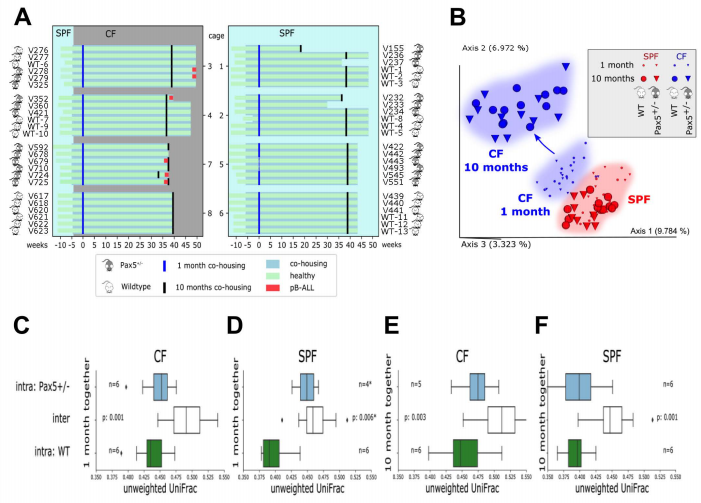 為了研究腸道微生物群在Pax5+/-小鼠PB-ALL發(fā)育中的作用,我們建立了一個由24只對照仔鼠野生型(WT)和24只Pax5+/-雌性小鼠組成的小鼠隊列。每籠飼養(yǎng)6只小鼠,分別飼養(yǎng)在混合基因型籠子(每個基因型3只,籠子1-4)或相同基因型籠子(同一基因型6只小鼠,籠子5-8)中(圖1A)。
