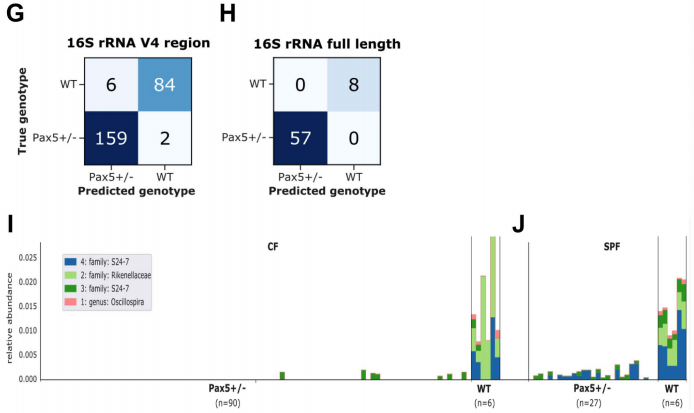 我們通過獨立地將機器學(xué)習(xí)方法應(yīng)用于3983個ASV,進一步將基因型分離ASV的集合細化到只有40個。ASV根據(jù)特征重要性進行排序,由“隨機森林”算法確定,41個ASV用50%的樣本進行訓(xùn)練,并在剩余50%的樣本上進行測試。這40個ASV足以準確(96.8%)預(yù)測小鼠基因型(圖1G)。事實上,這種機器學(xué)習(xí)工具能夠預(yù)測小鼠的基因型,這證實了Pax5雜合性形成了特定的腸道微生物群落。值得注意的是,16S rRNA全長測序使我們僅使用5212個全長ASV中的4個,就進一步提高了Pax5+/-和WT動物之間的基因型預(yù)測的準確性,準確率達到100%(圖1H)。WT和Pax5+/-小鼠微生物群的主要區(qū)別在于Pax5+/-小鼠缺乏完整的共生菌。具體地說,在WT小鼠中可以檢測到的Rikenellaceae、S24-7和Oscillospira屬的成員在CF的Pax5+/-小鼠的微生物群落中缺失(圖1I)。在SPF中,在Pax5+/-小鼠的微生物群落中沒有檢測到Rikenellaceae和Oscillospira屬的成員(圖1J)。