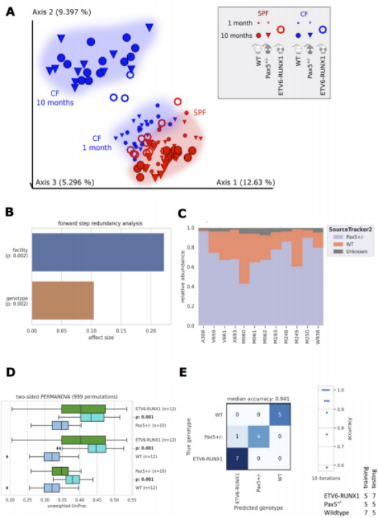 Sca1-ETV6-RUNX1小鼠在SPF組10個月時和CF組3~4個月時進行微生物群分析。將這些數(shù)據(jù)與我們之前的分析相結(jié)合,證實了環(huán)境(設(shè)備)和基因型是形成腸道微生物群的關(guān)鍵因素(圖2A,B)。SourceTracker2分析表明,Pax5+/-微生物來源在Sca1-ETV6-RUNX1微生物群的組成中也很突出(圖2C),PERMANOVA分析結(jié)果證實,所分析的基因型形成的微生物群有統(tǒng)計學(xué)上的顯著差異(圖2D)。使用10個最重要的ASV(有1000棵樹的隨機森林),可以通過機器學(xué)習(xí)準確地預(yù)測易感基因型(圖2E)。這些分析證實,在遺傳上易患PB-ALL的基因型都有不同的微生物群,獨立于外圍的B細胞有缺陷。