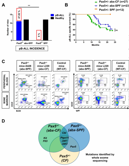 在23只小鼠中,11只(47.82%)在11.4到20.7月齡之間出現(xiàn)了PB-ALL,而SPF中未經(jīng)治療的Pax5+/-小鼠(n=12)沒有發(fā)生白血病(圖4A-D)。這些白血病在表型、組織學(xué)、克隆性和遺傳學(xué)特征上與暴露于自然感染的Pax5+/-小鼠中出現(xiàn)的白血病相似。這表明,完整的微生物群可以保護遺傳易感的小鼠免受白血病的侵襲,即使在沒有感染環(huán)境的情況下,通過抗生素治療后的細菌枯竭來改變微生物群也可能引發(fā)白血病。